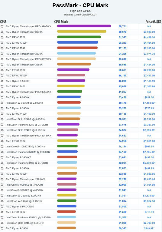 상위권에 자리 잡고 있는 CPU를 살펴보면 라이젠이 압도적인 것을 살펴볼 수 있습니다.