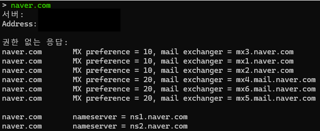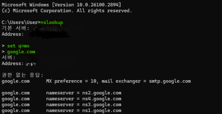 2. nslookup 명령어를 사용하여 MX 레코드 조회