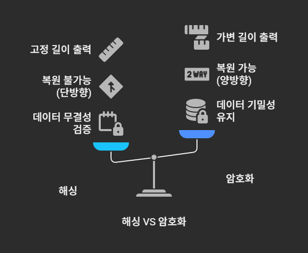 | 목적 | 데이터 무결성 검증, 빠른 검색 | 데이터 기밀성 유지 |
