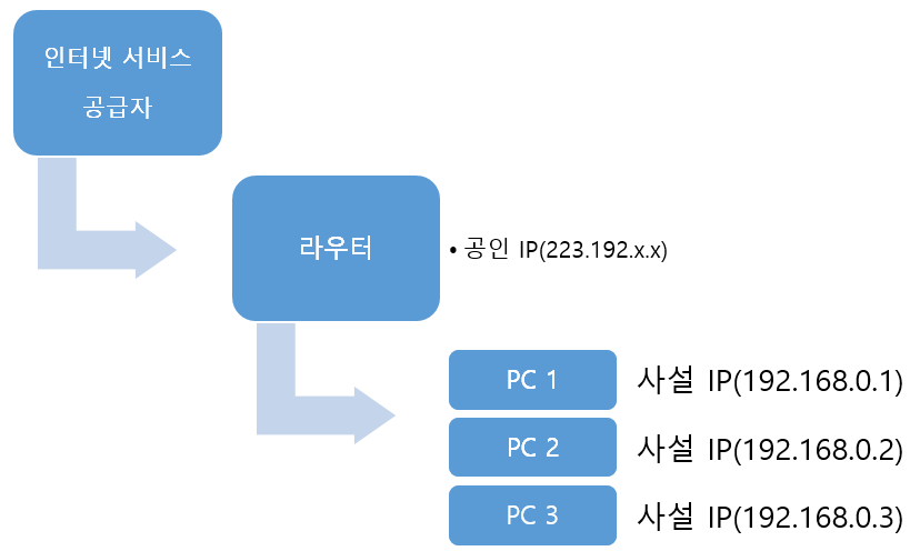 공인 IP 1개를 라우터에 할당하고, 라우터에 연결된 개인 PC들은 사설 IP를 각각 할당해준다.