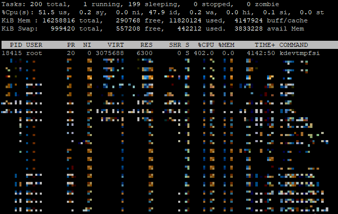 아래 사진과 같이 CPU에 부하를 주는 프로세스는 kdevtmpfsi 였고, 해당 프로세스가 현재 제공 중인 서비스와 무관하게 실행되고 있다는 것을 확인하고 kill 명령어를 통해 강제로 프로세스를 죽여도 몇 분 뒤 재가동되는 것을 확인하였습니다.
