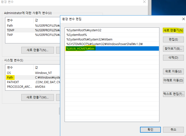 3. 시스템 변수 → Path [편집] → [새로 만들기] → %JAVA_HOME%\bin 입력