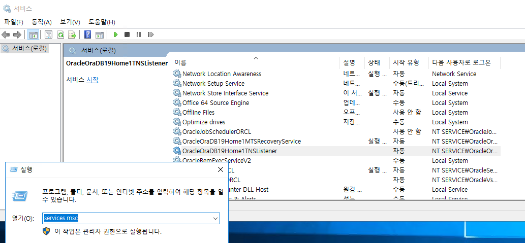 실행창(Ctrl + r)을 열어주신 뒤에 services.msc 입력 후 확인 → OracleOraDB19Home1TNSListener 상태 확인