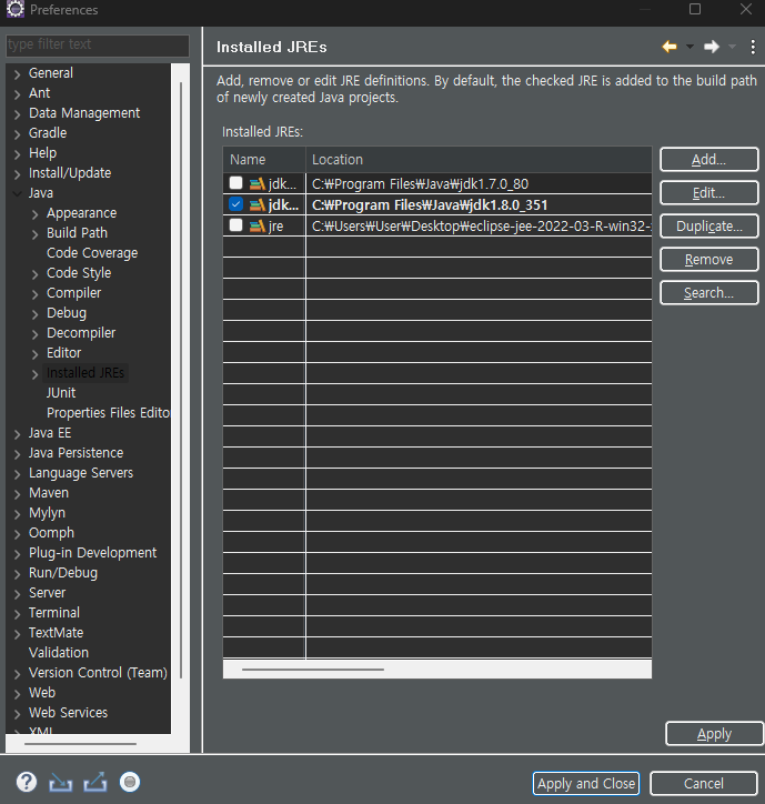 5. 추가한 jdk1.7 버전을 체크한 뒤에 [Apply]