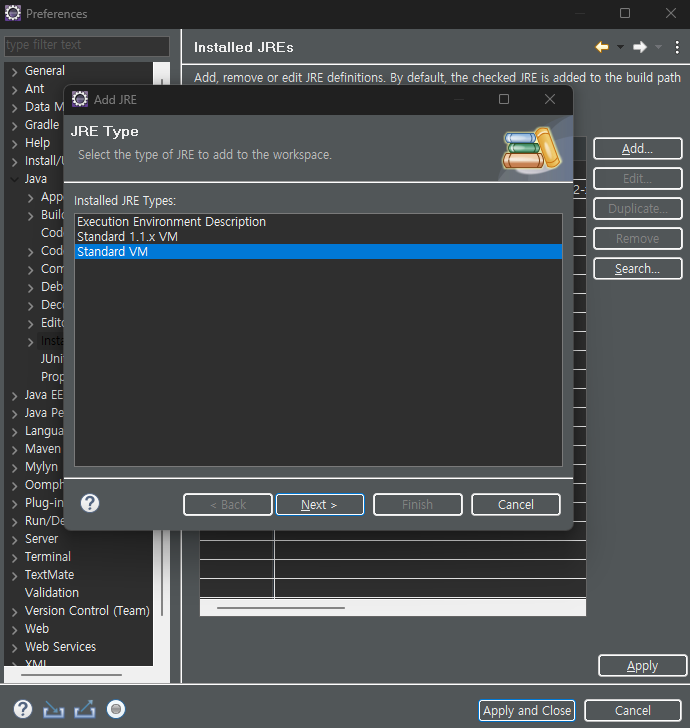 3. JRE Type은 Standard VM을 선택해 준 뒤에 [Next]